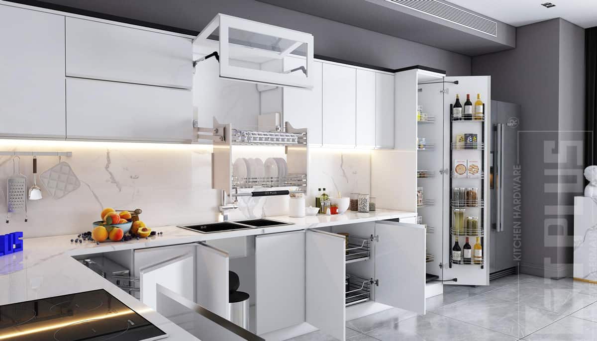 Hệ thống tay nâng cánh tủ bếp, giúp bạn có thể dễ dàng lấy vật dụng bên trong mà không bị cánh cửa cản tầm nhìn. Không những thế, với tay nâng loại thường sẽ chỉ dừng lại ở điểm cuối rất tiện lợi.