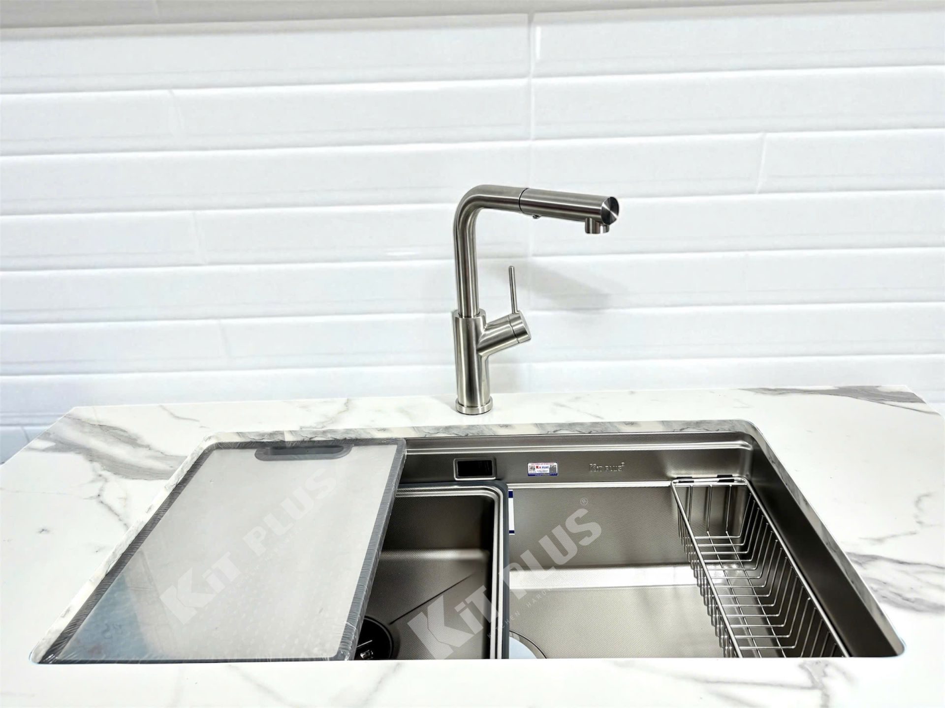 - Thiết kế hiện đại với gờ hạ bậc – tích hợp phụ kiện thông minh: Thớt inox cao cấp, rổ phụ, Siphon chữ Z Cao cấp