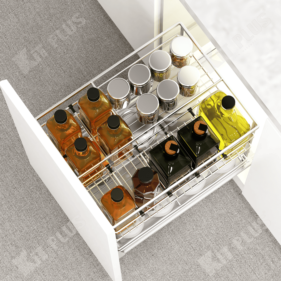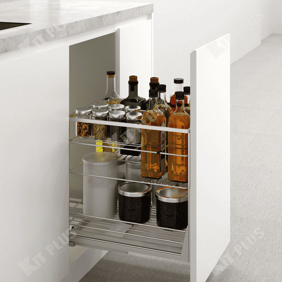 Giá gia vị DS.40 là sản phẩm vô cùng hữu ích cho không gian tủ bếp dưới, đây là sản phẩm được thiết kế mới dựa trên công trình nghiên cứu thói quen sử dụng của người Việt trong nhiều năm, Với thiết kế đạm chất Á Đông mà DS series mang lại mà nó nhanh chóng được chị em nội chợ chào đón, Ngoài trừ các lọ gia vị thông thường DS còn chứa được vô số các đồ dùng bếp khác như thớt thái đồ chín,cối,chày…. sản phẩm có kèm khay hứng nước tiện lợi.Và không thể thiếu đó là chất liệu Inox 304 có độ bền cao cùng với ray trượt âm tích hợp song song giảm chấn tối đa, chịu trọng tải cao, đóng mở vô cùng dễ dàng. Dưới đây là các ưu điểm nổi bật của giá gia vị KIT PLUS so với các dòng sản phẩm khác trên thị trường :