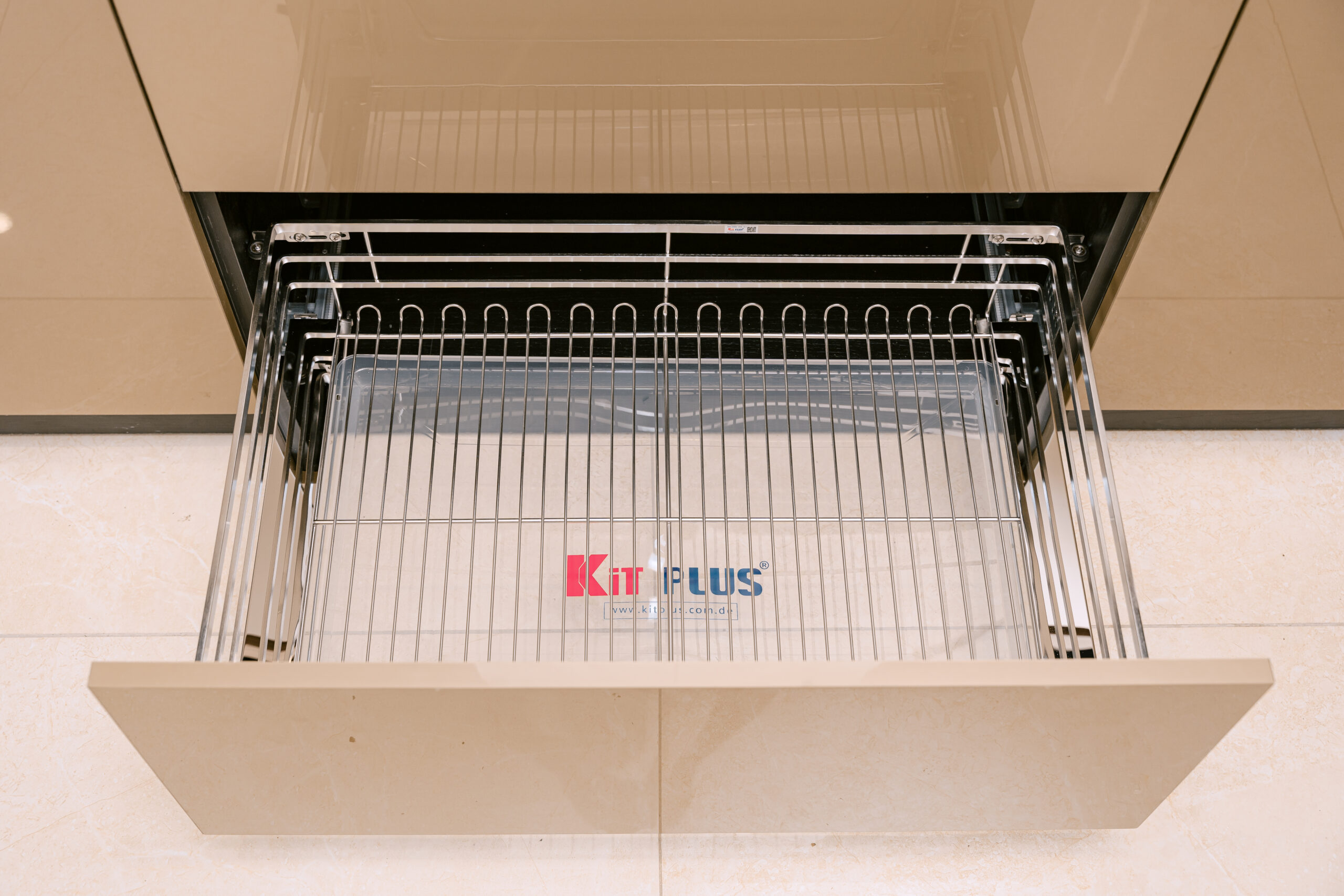Phía dưới kệ được trang bị khay hứng nước tháo rời, giúp ngăn nước nhỏ giọt xuống sàn tủ, giữ không gian bếp luôn khô thoáng, sạch sẽ và dễ dàng vệ sinh sau mỗi lần sử dụng.