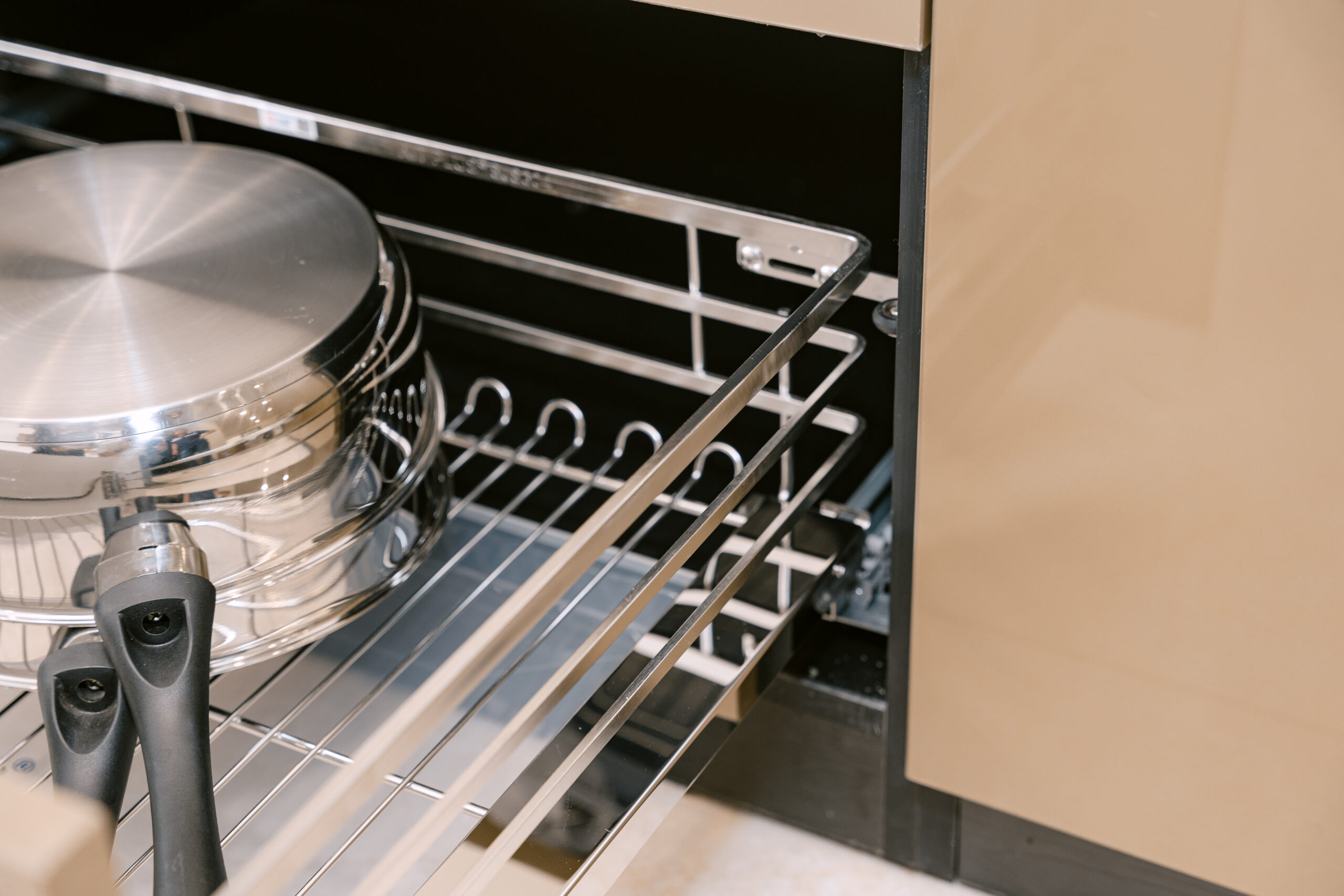 Với kích thước khoang tủ từ 700mm đến 900mm, sản phẩm giúp tận dụng toàn bộ chiều sâu của tủ dưới, tối đa hóa khả năng lưu trữ xoong, nồi, chảo, bát đĩa hoặc các vật dụng cồng kềnh khác.