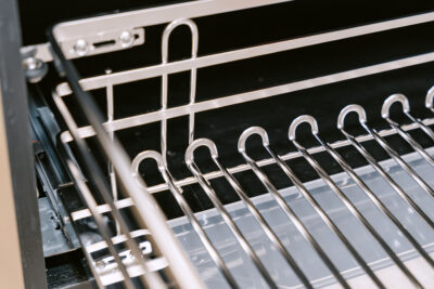 Kệ được trang bị hệ thống ray giảm chấn 3 lớp, hoạt động êm ái và bền bỉ. Dù chứa nhiều nồi chảo nặng, kệ vẫn trượt ra vào nhẹ nhàng, không gây tiếng ồn, tạo cảm giác dễ chịu trong từng thao tác nấu nướng.